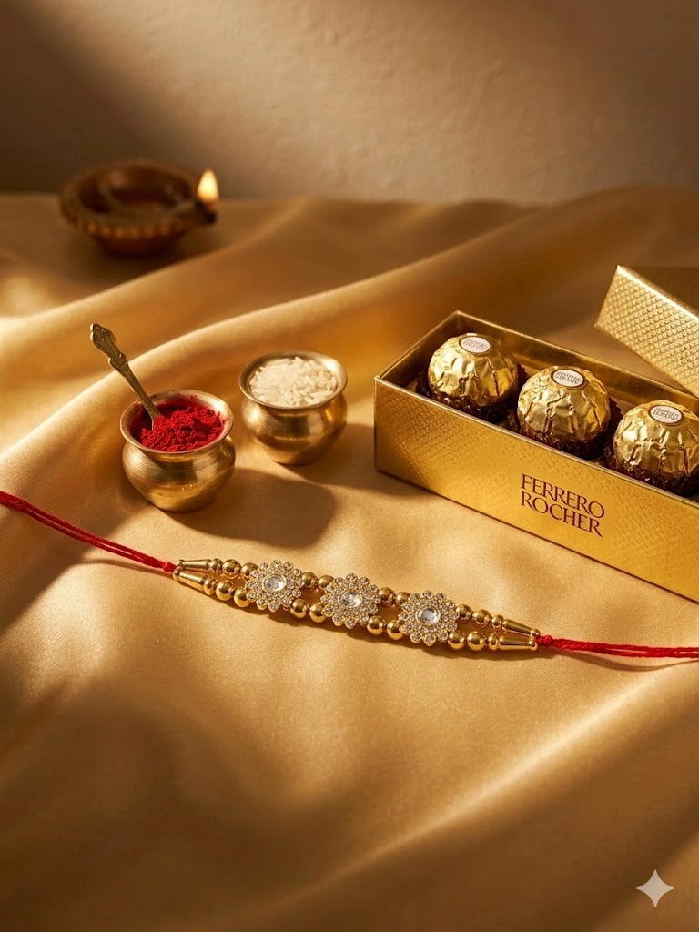 Add sparkle and sweetness to your Raksha Bandhan with this Gold and Crystal Rakhi paired with chocolates. The premium design and tasty treats create a perfect festive experience. A beautiful way to make the occasion memorable.