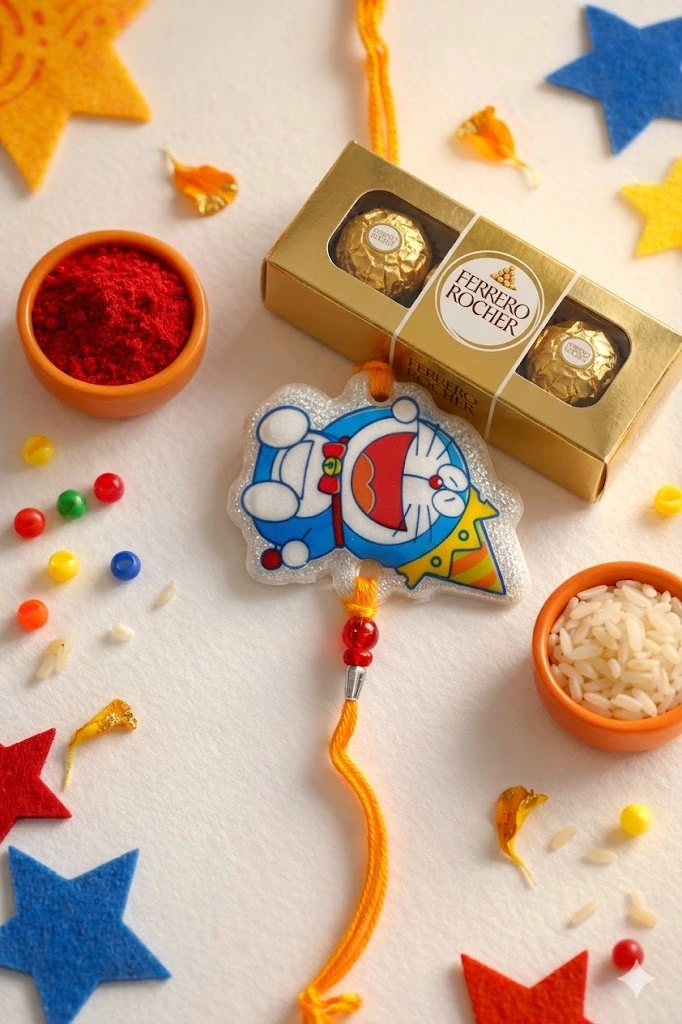 Make Raksha Bandhan fun for kids with this adorable Doraemon Rakhi with Chocolates combo. This Rakhi with Chocolates gift set includes a cute Doraemon rakhi along with chocolates and roli moli for the festive ritual.
