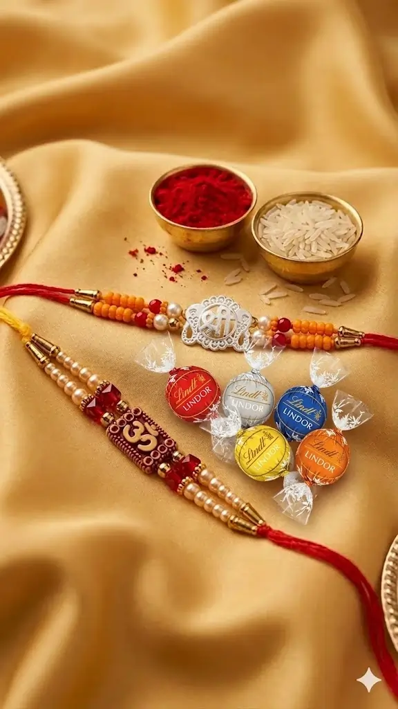 A divine Om Shree rakhi paired with delicious chocolates, perfect for adding blessings and sweetness to your Raksha Bandhan celebrations. A meaningful gift to express love and positivity.