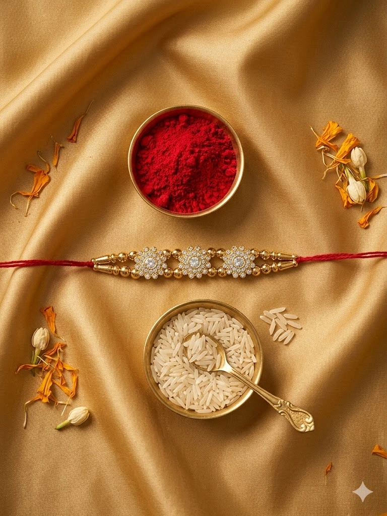 Make your Raksha Bandhan extra special with this Gold and Crystal Single Rakhi. Sparkling crystals and golden accents combine to reflect your love, care, and the treasured bond with your brother.