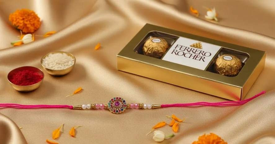 Celebrate the festival with this vibrant Multicolor Rakhi with Chocolates combo featuring a colorful designer rakhi with chocolates and roli moli.